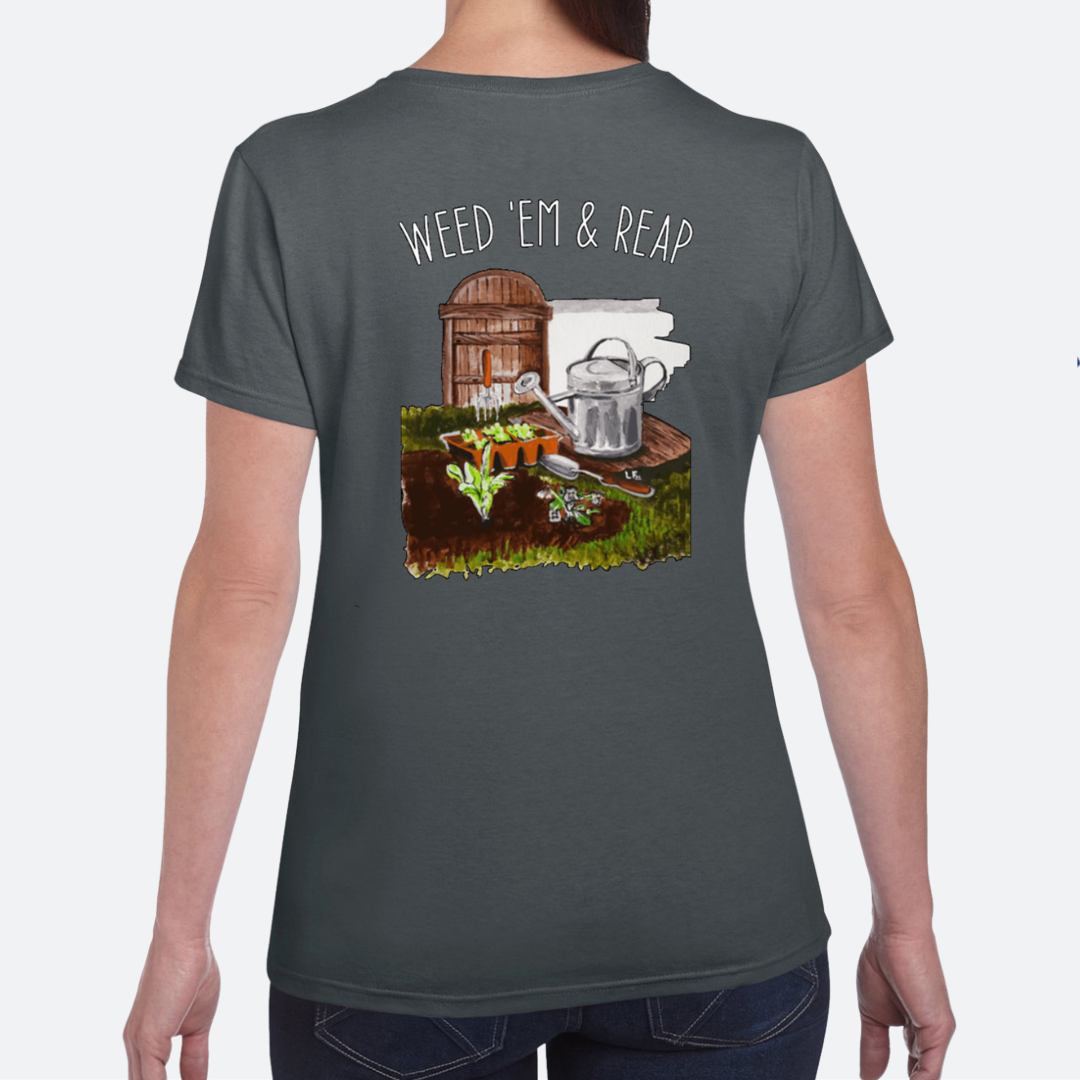 - Back of Shirt: "Weed Em & Reap" above garden door & watering can. Handpainted by Boston Artist @ighawkfarm