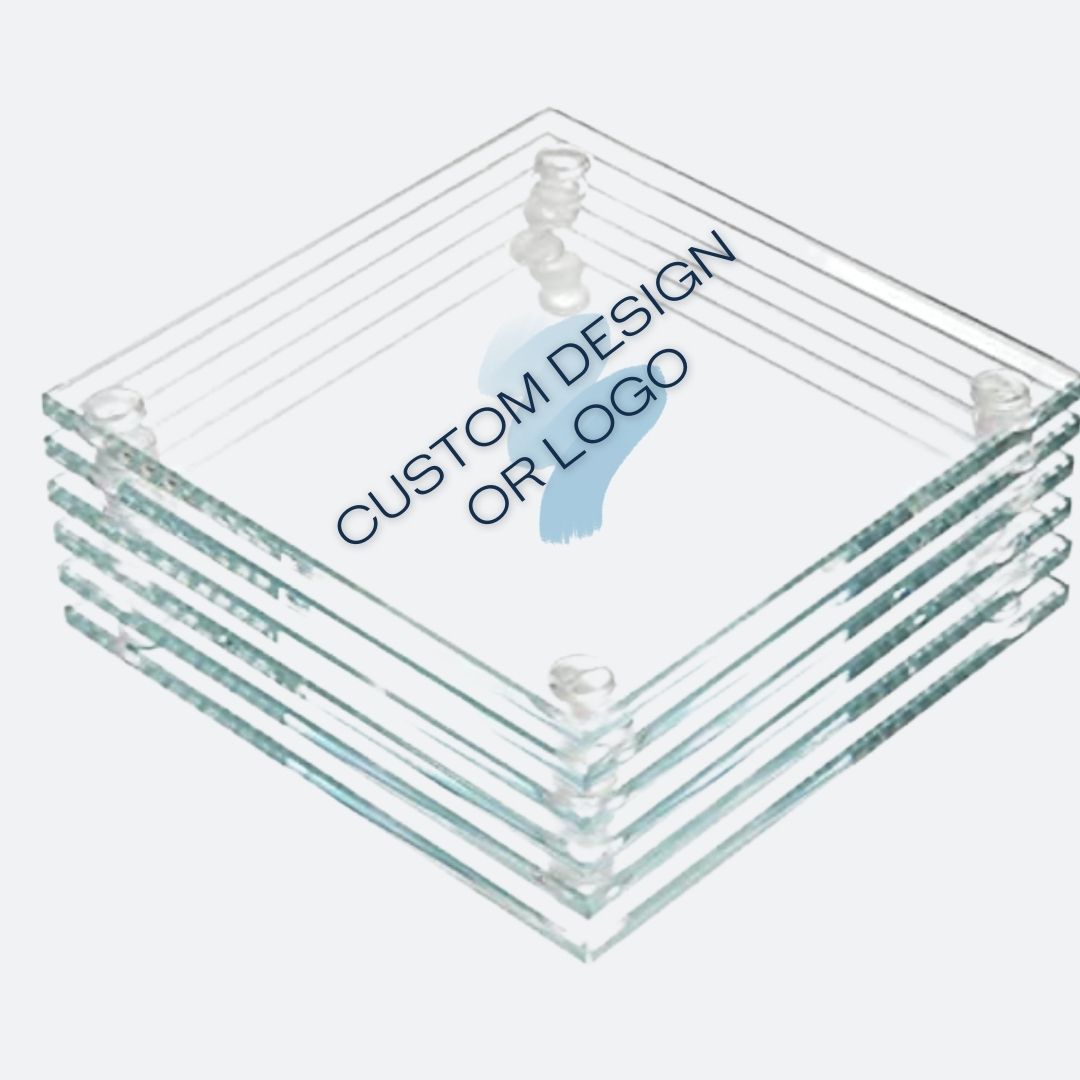 These clear coasters are made from glass and have rubber feet to prevent them from slipping. Square Coasters: The size of each coaster is 3.5”. These square coasters will help you protect your tables and other furniture from dangling water rings. The design is applied by hand in a way that is not affected by drips or spills.