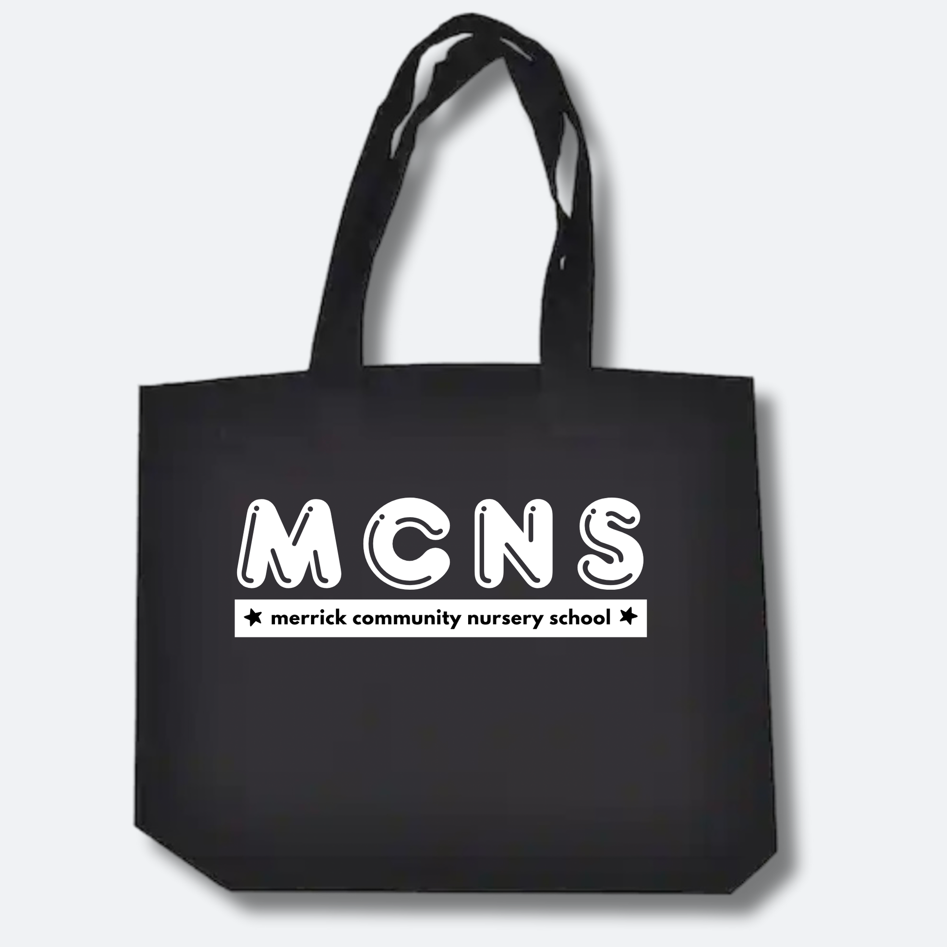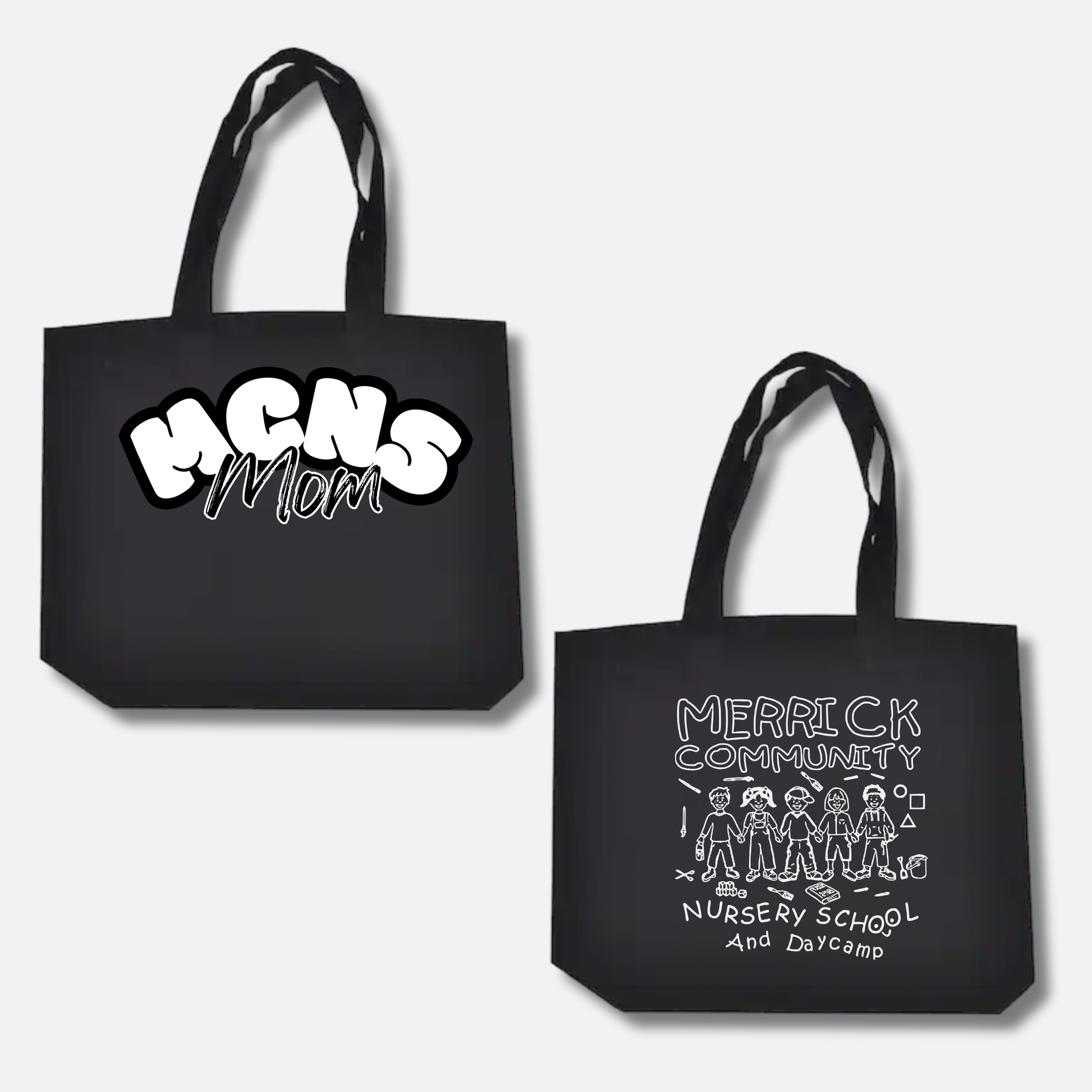 This handy tote bag (black tote with white design) is eco-friendly, washable and reusable; 15"W x 16"H with 27" soft self-fabric handles so you can comfortably carry all your on-the-go items over your shoulder.