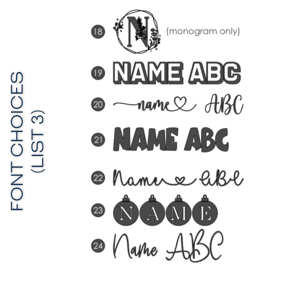FONT: Default font is #8 that is pictured. If alt is desired, please include in "SPECIAL INSTRUCTIONS" section on the "MY CART" page.