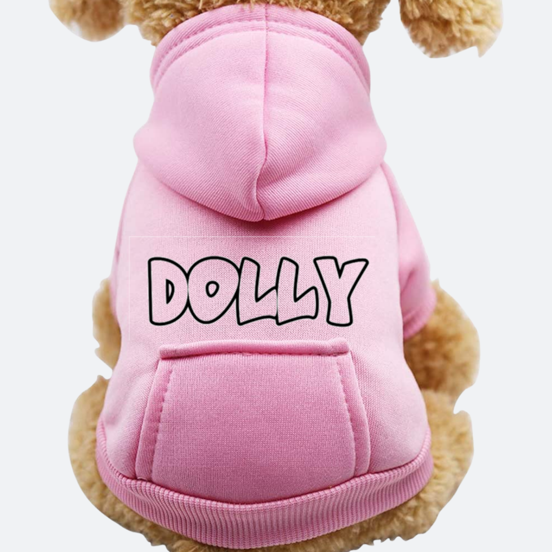 This adorable hoodie will not only keep your dog warm, but will help up their coolness on the block. Available in light gray or pink, personalized with fun, black bubble letters.