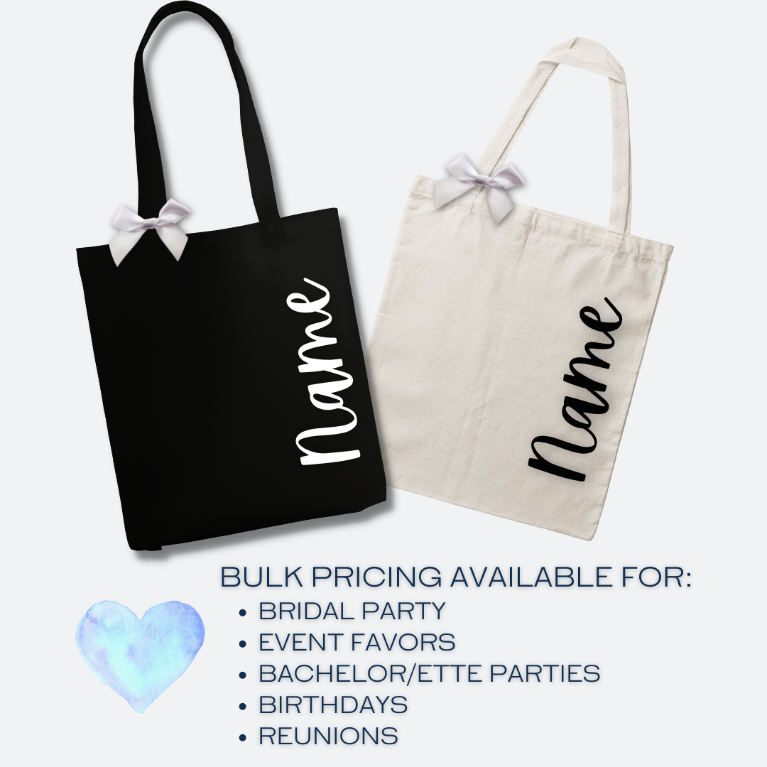 The totes pictured are eco-friendly, washable and reusable; 15"W x 16"H with 27" soft self-fabric handles so you can comfortably carry all your larger wedding items over your shoulder.